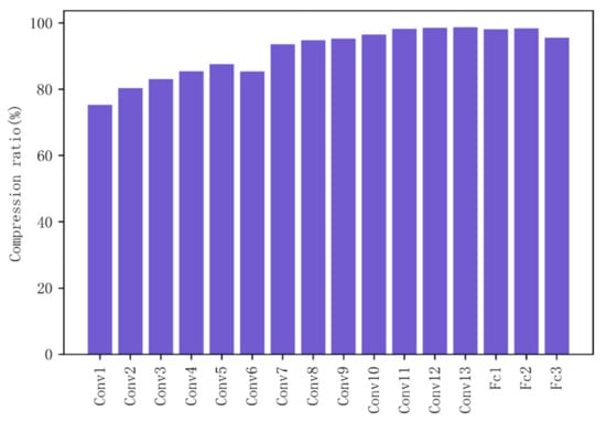 Figure 11 provides a visual comparison of the compression of storage resources consumed by each layer of the model in percentage form. As can be seen from the figure, as the number of layers deepens, the consumption of storage resources by each layer of the model usually exhibits a trend of gradually increasing compression. Shallow networks are mainly responsible for extracting low-level features from the input data, which tend to be more specific and detailed and thus require a high level of precision to retain enough information. Deep layer networks, on the other hand, deal with high-level features after multiple layers of abstraction, which are more generalized and require relatively low precision. As a result, greater compression rates can be employed at deeper layers without significantly affecting model performance. In addition, as the depth of the network increases, the connections between different layers may become more redundant. Certain parameters in the deeper layers have less impact on the final output and can be effectively compressed by reducing the number of these parameters or decreasing their precision. In contrast, the shallow layer has a relatively small compression space due to the direct processing of the original input data and stronger dependencies between its parameters. As the number of network layers increases, the model can compress at a higher rate, thus saving storage resources.