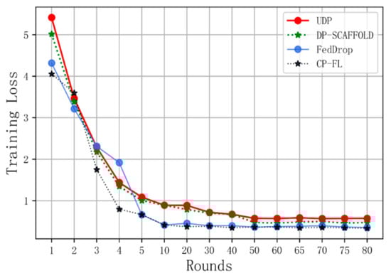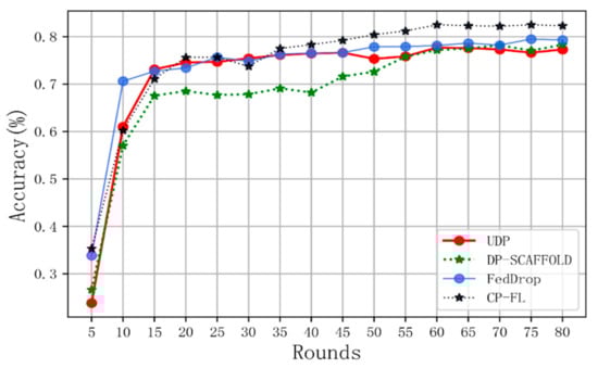 We reflect the training effect of the model with the change of accuracy vs. loss function, and the experimental results on the CIFAR-10 dataset are shown in Figure 14 and Figure 15 Approximating a uniformly assigned privacy budget of for each user, the CP-FL mechanism shows an advantage over FedDrop with FedAvg under the rounds horizontal axis. Surprisingly, at a very high dropout rate of 80%, the CP-FL mechanism instead achieves almost optimal training results due to the fact that the high dropout rate saves a large amount of the privacy budget, thus leading to superior model usability while keeping privacy constant. Similarly, we also examined the impact that different privacy preservation levels bring to the usability of these methods by attempting to approximate the privacy budget as to express the usability in terms of the accuracy of the model. The experiments show that maintaining a high privacy-preserving level of the privacy budget , the CP-FL mechanism can still be trained to obtain sizable model accuracies, exceeding other federated learning architectures at the same privacy-preserving level.