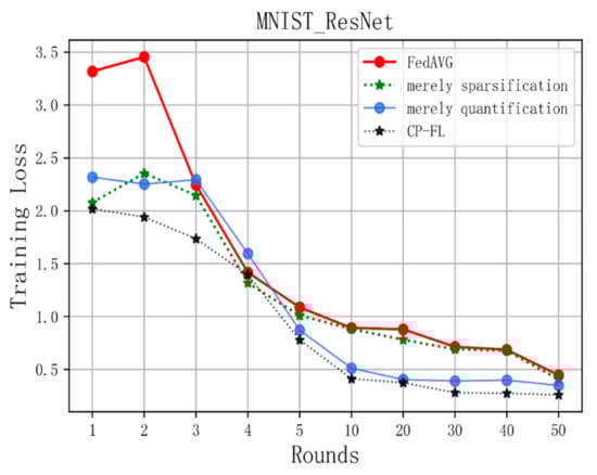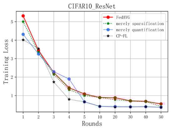 Within this framework, the experiments were conducted using the training results of the federated averaging algorithm without any compression processing as the baseline, and subsequently, the versions of the models focusing on a single means of compression (sparsification only and quantization only) were generated within the CP-FL framework by disabling the quantization or sparsification steps individually as a way to directly compare their efficacy with the comprehensive compression scheme of CP-FL. According to the experimental process, the training loss values of all models show a gradual decrease with the number of training rounds. In particular, when the training reaches the preset number of rounds, 50, the CP-FL method exhibits a model loss level that is very close to that of the original uncompressed model, which demonstrates the significant advantage of CP-FL in maintaining the model prediction accuracy. In contrast, the sparsification or quantization compression strategies implemented alone, while also contributing to loss reduction, end up with relatively high loss levels, revealing the limitations of these two single approaches in maintaining the original accuracy of the model. As seen in Figure 16 and Figure 17, the joint compression approach can effectively preserve and even optimize the prediction accuracy of the model while improving its efficiency, providing strong support for efficient model deployment in resource-constrained environments.