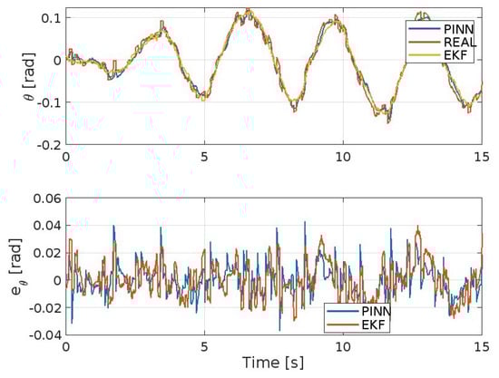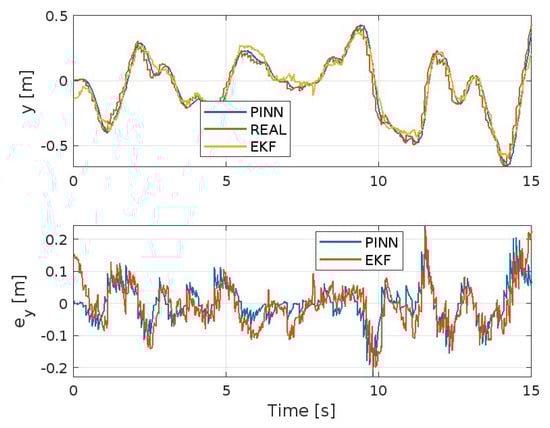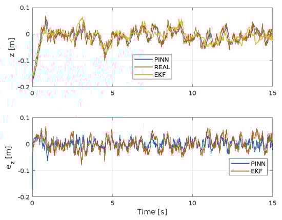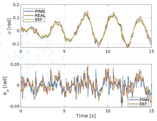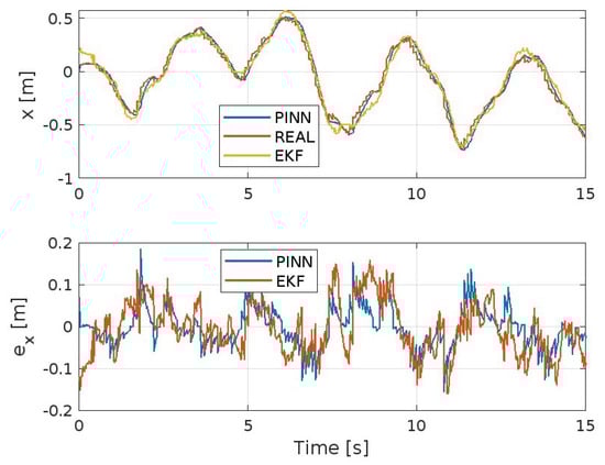 Figure 3, Figure 4, Figure 5, Figure 6, Figure 7 and Figure 8 show the trends of the Extended Kalman Filter and PINNs to approximate the real system, respectively, for position x, y, z, and the angles ϕ , θ , and ψ . Both methods will achieve excellent results considering the type of maneuver presented here and the disturbances present. But it is evident that the PINNs outperform the EKF, with the additional strength of requiring a reduced computational effort, despite the fact they require training prior to their use or during the simulation.