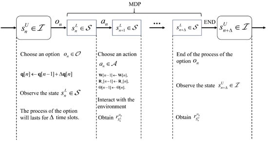 - Policy set : denotes the policy set under an option ; since our option is the adjustment of locations of the UAV and we choose proper options to maximize (), the policy function can be described as the adjustment of the beamforming matrix, the sensing signal of the UAV, and the passive beamforming matrix of the RIS under the option , which are actions required to complete an option and can be described as: