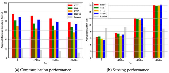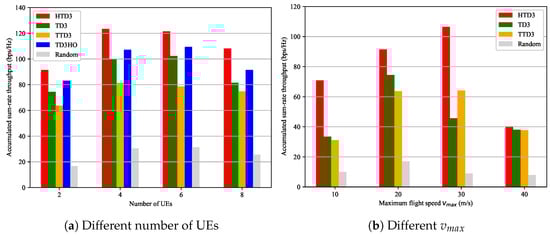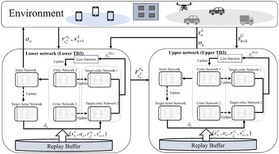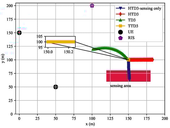 - TTD3: TTD3 was proposed in [25] and uses two agents to output two different sets of actions. In this article, in the TTD3 case, two agents are adopted to adjust the location of the UAV and handle the sensing and communication tasks. Differently from HTD3, which is a hierarchical structure, although both TTD3 and HTD3 contain two agents, TTD3 adopts a parallel structure, which outputs all actions simultaneously. We use this benchmark to verify the effectiveness of our hierarchical structure design.