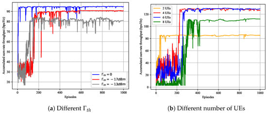 - Reward : Since our object is to maximize the sum-rate throughput during the whole N process, the sum-rate throughput within time slot n can be directly used as the reward, which can be expressed aswhere denotes the reward obtained by executing action at the state , and denotes the penalty coefficient, which is set to 0 (i.e., no data transmission).