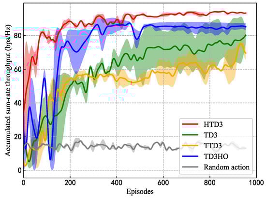- We simulate the proposed algorithm and other benchmarks for comparison. Extensive results represent the effectiveness and superiority of the proposed HTD3. Specifically, we verify the convergence of the proposed algorithm via different environment parameters based on numerous experiments, and the experimental results demonstrate that HTD3 achieves a higher sum-rate throughput compared to other benchmarks.