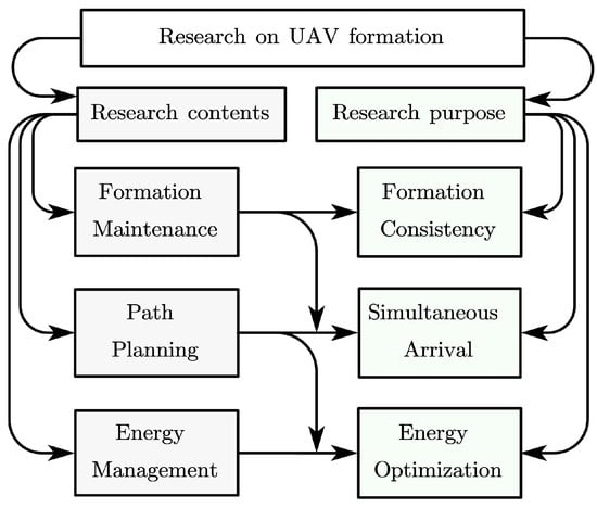 Through an analysis of existing literature on UAV formations, we have summarized the primary research from two perspectives: research content and research objectives, as illustrated in Figure 1.