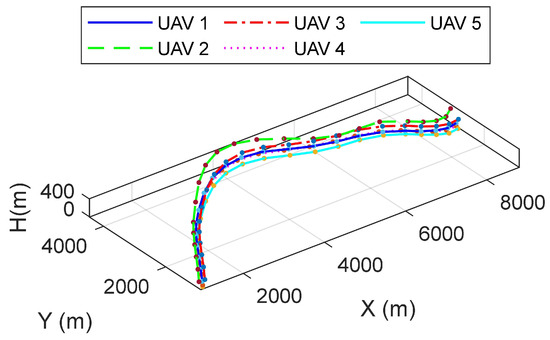 As shown in Figure 8, at the end of the trajectory, the UAV formation appears relatively dispersed, which requires some UAVs to hover in order to ensure coordinated arrival of the formation.