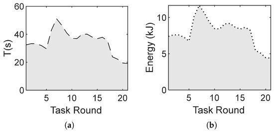 By executing Algorithm 1, the time taken and total energy consumption for each task round of the UAV formation are obtained, as illustrated in Figure 5.