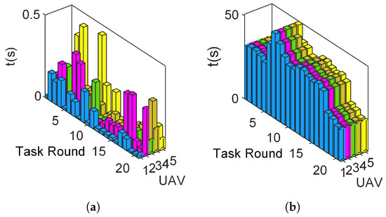 Furthermore, the changes in acceleration time and constant speed flight time for the UAV formation during each task round are presented in Figure 7.