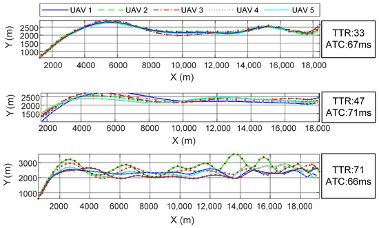 To further validate the proposed method’s computational performance in handling different UAV formation trajectories, we designed experiments involving five UAVs with distinct flight paths, corresponding to scenarios with varying total task rounds (TTRs). The experiments were conducted on a desktop computer equipped with an Intel i5-12400F CPU, 16 GB of memory, and the Windows 10 operating system. The computation time for solving each task round was recorded, and the average task computation time (ATC) for different trajectories is shown in Figure 11.