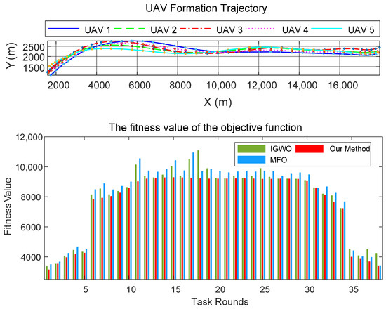 Firstly, we evaluated the solution accuracy of three algorithms when applied to the same UAV formation trajectory. Specifically, accuracy is reflected in the fitness values of the objective function calculated in each iteration. A smaller fitness value indicates higher solution accuracy. The UAV formation trajectories and the fitness values of the objective function for each algorithm across all iterations are shown in Figure 12.
