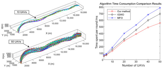 Comparison of algorithm running time for different numbers of UAVs. (Left): UAV flight trajectories corresponding to different numbers of UAVs; (Right): Comparison of running time for different algorithms.