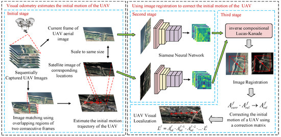 The proposed pipeline for our visual localization method begins by utilizing visual odometry techniques to process consecutive aerial images captured by the drone. This step estimates the initial motion of the drone and determines its initial position within the satellite imagery. Subsequently, an image registration network is employed to correct the motion of the drone, aiming to eliminate cumulative errors and ultimately ascertain the precise location of UAV.