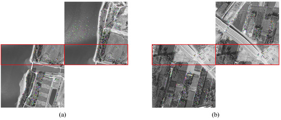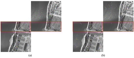 (a,b) are aerial images of a drone in two different scenes taken in consecutive frames. The red box indicates the common part of the consecutive frames, where the phenomenon of feature points being densely distributed is very obvious. Most feature points are densely located in regions with significant texture variations. If the overlapping areas of consecutive drone-captured frames do not include regions with pronounced texture changes, the accuracy of image matching can be significantly reduced, leading to erroneous estimation of the drone’s initial motion.