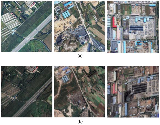 (a) represents UAV aerial images, while (b) represents satellite images. UAV aerial images and satellite images of the same area exhibit significant visual discrepancies due to differences in imaging principles, capture times, and other factors. These discrepancies pose considerable challenges for image matching.