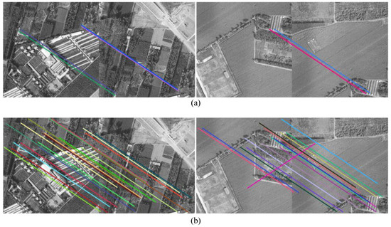 Registration results of drone aerial images in high-texture areas. (a) represents the registration results based on VGG16, and (b) represents the registration results based on the proposed method in this paper.
