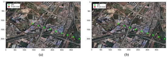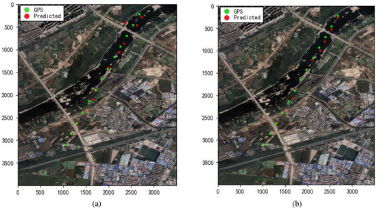 Figure 13 illustrates the positioning results for low-texture routes, where the flight direction is from left to right on the satellite map. The findings show that the predicted drone coordinates from both methods closely align with the actual positions, demonstrating a high level of positioning accuracy.