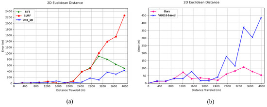 This study utilizes absolute positioning error as an objective metric to evaluate the positioning results. It specifically measures the two-dimensional Euclidean distance between the predicted coordinates and the actual GPS coordinates for each frame. Within the same network architecture based on the VGG16 structure, we compare the positioning errors associated with the SURF, SIFT, and improved Oriented FAST and Rotated BRIEF (ORB) algorithms. Furthermore, using the improved ORB algorithm as the feature point detection method, this study also examines the positioning errors obtained from both the VGG16 network structure and the proposed method. Figure 11 displays the positioning error line chart for the methods discussed. The data shows that, under the same network architecture, the positioning errors of the improved ORB (ORB_Qt) algorithm are notably lower than those of the SURF and SIFT algorithms. In low-texture areas, the errors for each frame using the VGG16 network structure tend to increase gradually. In contrast, the errors for each frame produced by the proposed method remain consistently small and stable. These results indicate that the positioning outcomes from the proposed network structure are clearly superior to those obtained with the VGG16 network structure.