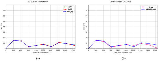 The comparison experiments for high-texture and low-texture routes utilized the same methodology. Figure 14 presents the positioning errors for high-texture routes. It is clear from the figure that the errors of the three feature point detection algorithms are largely consistent across the same network architecture. When applying the same feature point detection algorithm, the proposed network structure produces positioning errors similar to those of the VGG16-based method. However, the results from the proposed method exhibit greater stability.