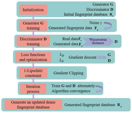 - In the offline phase, the WGAN algorithm is used to supplement and complement the data in a coarse-grained fingerprint database. The generator and discriminator are trained using the initial RSS dataset, and the synthesized RSS data are generated using the generator and fed into the discriminator along with the real data for adversarial training. During the training process, the weights of the generator and discriminator are adjusted so that they are balanced. The feasibility and effectiveness of the proposed method are verified by algorithm derivation and simulation test.