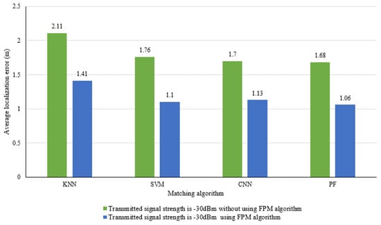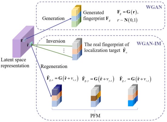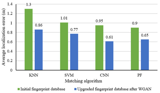 - In the online localization stage, the PFM generated by the WGAN-IM is used for matching and positioning. The generator takes a single set of RSS values as input to locate the target and produces multiple sets of similar RSS values as output. The discriminator takes a set of RSS values as input and outputs a ratio indicating the probability that the input data are real. The Wasserstein distance (W-distance) is used as the loss function of the generator, so that the distribution of the generated data is close to the distribution of the offline fingerprint database. By training the generator and discriminator, the generator can generate data similar to real offline fingerprint data. The gradient clipping technique is used to ensure the stability of the Wasserstein distance during training. In this way, the point location of the target is extended to plane matching, and the experimental results show that this method improves the localization accuracy.