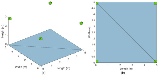 | Value | 2.4 GHz, 5 GHz | −10 dBm | (0, 0, 3), (0, 5, 3), (5, 5, 3), (5, 0, 3) | 5 × 5 × 3 | 1 m | 75 | 600 | 1 m/s | 20 | 0.5 s |