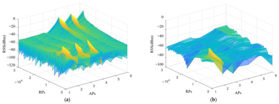 Figure 8. Display of the initial fingerprint database and the upgraded fingerprint database after the WGAN algorithm. (a) Initial fingerprint database R I , which shows the fingerprint data of 4 APs in 75 RCs; (b) upgraded fingerprint database R g , which shows the fingerprint data of 4 APs in 600 RCs.