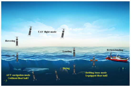 Since the Age of Great Navigation, people have come to realize that the ocean covers 71% of the Earth’s surface, and there is a huge amount of unexplored area. The vast ocean area is rich in biological resources, renewable resources, mineral resources, and other unexplored energy resources; it has become an important strategic resource affecting the global economy and has attracted increasing attention from all countries. The complex and changeable marine environment has a great impact on the implementation of human production and development activities. With the increasing maturity of modern electronic information technology, various types of marine development and monitoring equipment have emerged, such as marine unmanned aerial vehicles (UAVs) [1], unmanned underwater vehicles (UUVs) [2], unmanned surface vehicles (USVs) [3], and ocean observation buoys (OBs) [4,5], and other types of unmanned equipment have provided great convenience to researchers. The above-mentioned ocean observation equipment can only perform tasks in a single working medium; however, the increasing demand for multi-domain and cross-domain tasks means that the need for observation equipment capable of carrying out such tasks is becoming increasingly urgent [6]. A type of hybrid aerial–underwater vehicles (HAUVs) with a water–air amphibious operation capability has emerged. The unique multi-media maneuverability of HAUVs gives them strong potential for military and civil applications [7], and it has attracted extensive attention from scholars in recent years. Researchers from various countries have conducted active research on HAUVs and obtained fruitful research results [8,9].