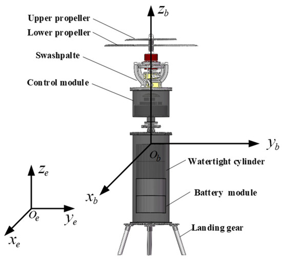 The mass of the coaxial HAUV is uniformly distributed on a cylindrical, watertight body structure, which is symmetric with respect to the three coordinate planes. Violent maneuvering is not considered during trans-media maneuvering, and the complex coupled hydrodynamic coefficients and higher-order hydrodynamic coefficients are neglected.