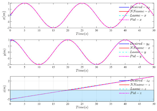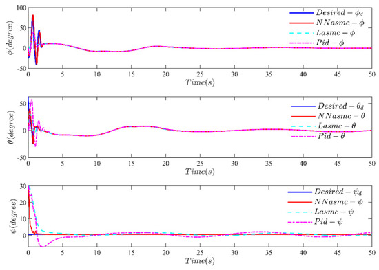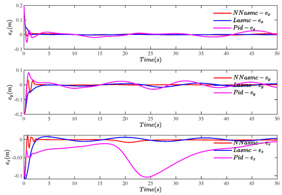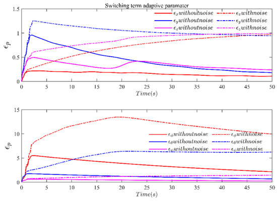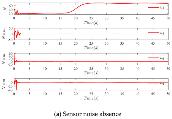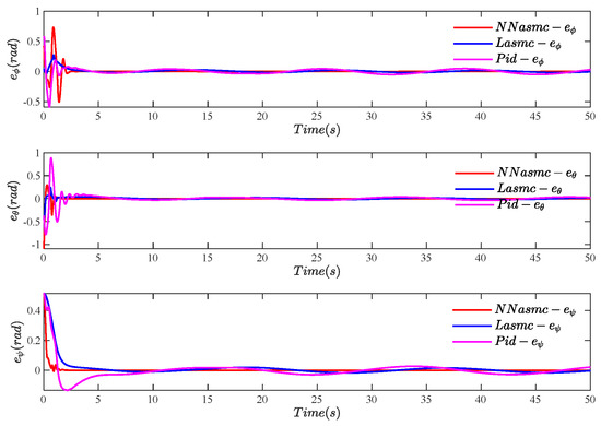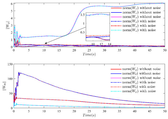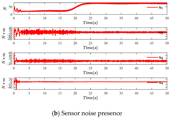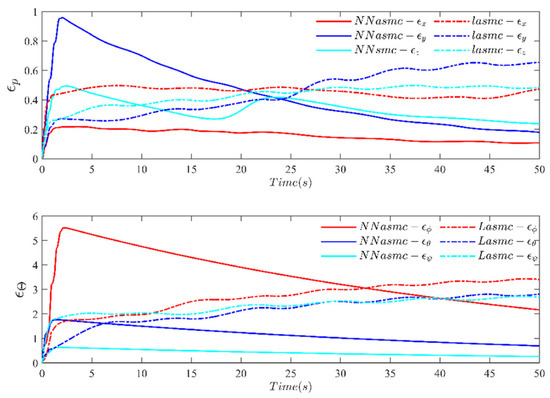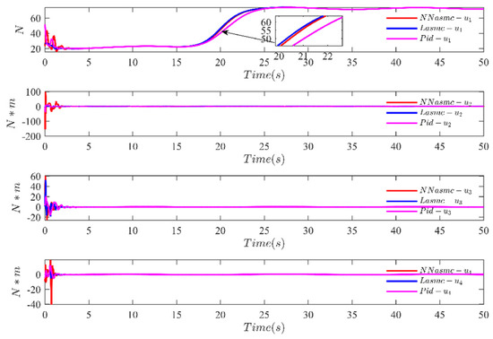 Figure 22 shows the evolution of the switching term adaptive law parameter over time for the NNASMC and ASMC. It can be seen that the switching term adaptive parameter first increases and then converges to a bounded constant, but the adaptive parameter of the NNASMC is larger than that of the ASMC. The main reason for this phenomenon is that the RBFNN approximator does not achieve an accurate approximation of the model‘s nonlinear function in the initial stage, which results in the robustness of the whole system being borne by the switching term; however, after the approximator achieves effective online identification, the switching term parameter of the NNASMC decays fast and is smaller than the switching term adaptive law parameter of the ASMC, which indeed attenuates the jitter effect effectively. The evolution results of the different controllers in solving the control inputs are shown in Figure 23. The evolution trends of the control inputs solved using the different controllers are similar; however, the designed NNASMC achieves the most accurate control signal in terms of the control effect.