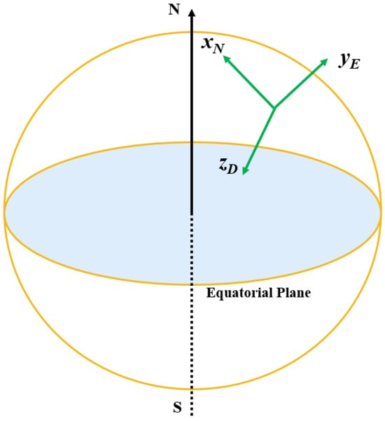 Select a point on the Earth as the origin Oe of the coordinate frame Se-Oexeyeze. The xe-axis lies in the horizontal plane and points in a specific direction. The ye-axis is also in the horizontal plane and is perpendicular to the xe-axis, with its direction determined by the right-hand rule. The ze-axis is perpendicular to the Earth and points away from the Earth’s center [44].