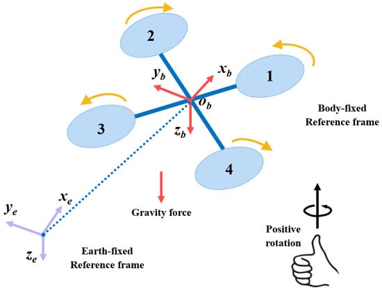 Two orthogonal coordinate frames are defined to describe the spatial position and relative motion of the quadrotor UAV. Quadrotor UAVs can utilize two reference systems, fixed and mobile, which distinguishes them from conventional helicopters that employ three reference systems. In contrast, the main rotor of a conventional helicopter is equipped with actuators for controlling the roll and pitch angles and moves independently of the fuselage. In this section, the fixed coordinate frame, also known as the inertial coordinate frame, is customarily used to enhance the clarity of the description. Its positive direction is in alignment with that of the rotorcraft UAV, as shown in Figure 1, with its vectors pointing toward the north, the east, and the Earth’s center.