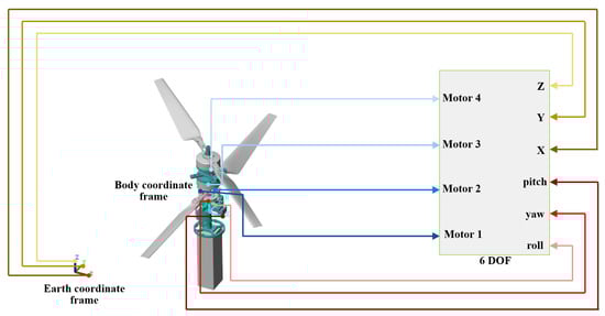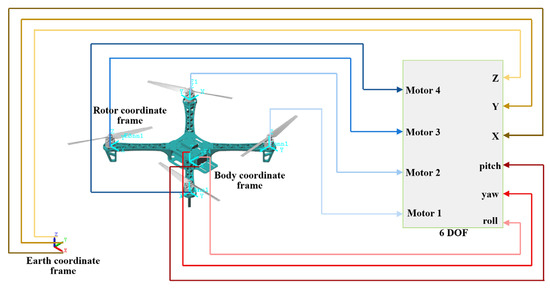 A 6-DOF model of a dual-rotor coaxial UAV has been constructed based on its physical parameters. The model takes in the swash plate, the top rotor’s velocity, and the bottom rotor’s velocity as inputs and outputs the position information of the rotorcraft UAV as well as its Euler angle. The overall construction model of the dual-rotor coaxial UAV model is shown in Figure 10. The connection between the motor and the body, and that between the steering gear and the body, is achieved using the rotary connection mode. In contrast, the connection between the swash plate and the body usually adopts the ball connection mode. The motor and the steering gear drive the real rotation mode, and the natural lift and torque are calculated based on the rotational velocity of the physical signal. The coordinate frame transformation is carried out in the physical model space.