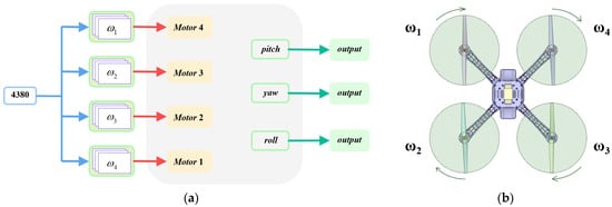 Specific PWM input values are provided to verify the correctness of the Euler angle attitude response under different PWM inputs and thus validate the six-DOF model of the F450 quadrotor. Generally, the diagonal motors have the same rotational direction while the adjacent motors have the opposite rotational direction, and the velocity PWM is set as 4380 (as shown in Figure 6a). The rotational velocity of the four motors is shown in Figure 6b. Note that the value of 4380 is arbitrarily set to verify the correctness of the feedback from the all-true composite motion model. The specific testing states are divided into four categories, as shown in Table 2, where the four-motor velocity are denoted as ω1, ω2, ω3, ω4, respectively. The initial positive direction is shown in Figure 6b. The “+” of the four velocity direction coefficients shown in Table 2 indicates the positive direction and the “−” indicates the negative direction.