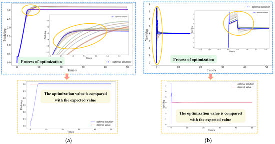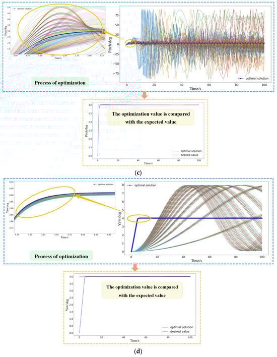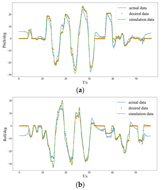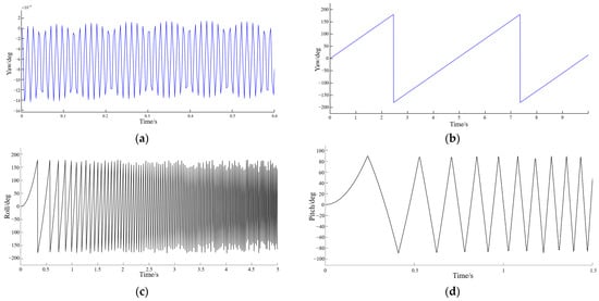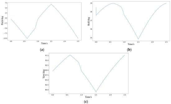 Regarding the expected values, actual values, and simulation values, the expected value curve was taken as the standard curve. The method of calculating the similarity through the Euclidean distance [52] was employed to compute the errors of the actual value curve and the simulation value curve in comparison with the expected value curve. Upon calculation, the errors of the pitch angle, roll angle, and yaw angle of the actual value curve relative to the expected value curve were 98.5157%, 98.9875%, and 99.9815%, respectively. Meanwhile, the errors of the pitch angle, roll angle, and yaw angle of the simulation value curve concerning the expected value curve were 99.7147%, 99.9174%, and 99.9862%, respectively. Based on these quantified error data, it can be concluded that the attitude control effect is quite satisfactory.