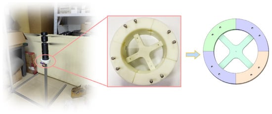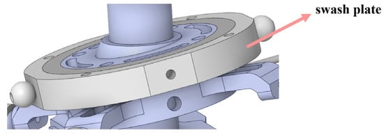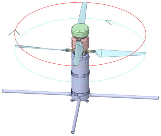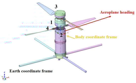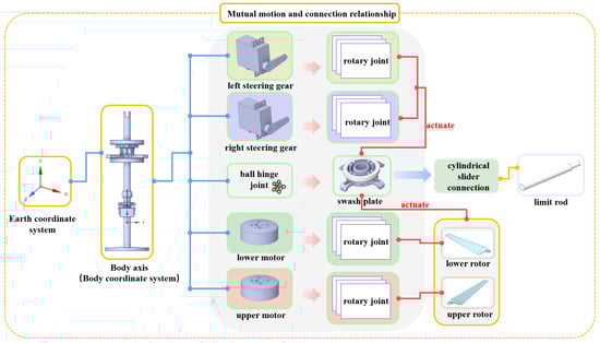 Similarly, geometry program was used to design a spatial three-dimensional geometry model of the dual-rotor coaxial UAV. The forward rotation directions of the upper and lower motors were specified (as shown in Figure 9). It has a single tilting disc structure located on the lower rotor, which is used to control the tilting of the lower rotor. The initial direction of the tilt plate is consistent with the vertical direction of the body coordinate frame, and the Earth coordinate frame is consistent with the initial direction of the body coordinate frame.