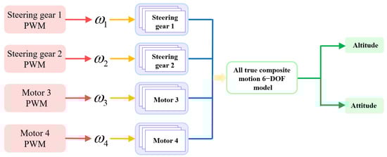 (1) In contrast to the mass point model [53,54], an all-true composite motion model of quadrotor and dual-rotor coaxial UAVs is constructed, which comprehensively represents the mechanical movements of all the modules during flight, including the tilting plate rotation, steering gear rotation, and motor rotation. The model successfully coupled each motion, thus achieving a true reproduction of the complex motion with high accuracy, and verified the accuracy of the 6-DOF model by analyzing the Euler angle response curves under different PWM input values, and the stability of the two types of rotorcraft UAV was verified. This all-true composite motion model provides strong support for the accurate design of the subsequent flight control system.