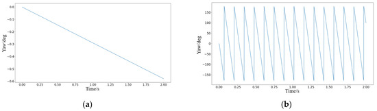 After analyzing the theoretical model, the angular attitude curve above was analyzed. State 1 shows that the quadrotor body can maintain a fixed yaw angle value at the beginning due to the center of mass not being entirely on the z-axis. However, deviation occurs in the absence of control, and the error gradually accumulates. The yaw angle response over time can be seen in Figure 7a. The curve data in the figure show that the center of fluctuation is close to zero, and the peak value of fluctuation is a minimum value, which is consistent with the objective law.