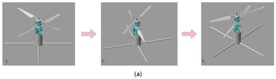 State 3 displays the rotation diagram in Figure 8b and the roll angle response over time in Figure 7c. From the roll angle response over time and the rotation diagram, the quadrotor model rotates around the x-axis. However, since the body itself is not entirely symmetrical, the changes are not remarkably uniform. Nonetheless, they meet the roll angle change law, consistent with the actual mechanical characteristics analysis.