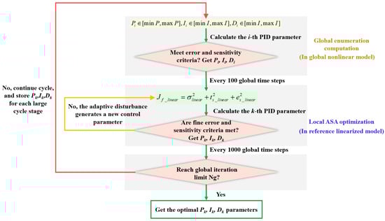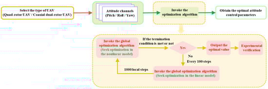 (2) Distinct from conventional proportional–integral–derivative (PID) control methods [55,56], a fast and intelligent PID control method is designed for adjusting the attitude and height of quadrotor and dual-rotor coaxial UAVs. By combining local optimization with global optimization, each PID parameter is optimized within a wide range. In local optimization, an adaptive simulated annealing algorithm is introduced to dynamically adjust the local control parameters, enabling a more flexible exploration of the solution space. The combination of global and local optimization can reduce the shortcoming of missing the optimal solution when using the adaptive simulated annealing algorithm alone. Meanwhile, the results of the turntable experiments show that the coincidence degree of the control curves of the designed controllers has reached more than 98.5%, indicating a relatively good control effect. Thus, the optimized solution is closer to the optimum, and the optimization speed is accelerated compared with the enumeration method. Automatic batch optimization of each PID parameter is carried out to obtain the relative optimal value, and a PID controller with optimal control parameters is constructed. The construction process reduces the complexity and time consumption of traditional PID controllers and greatly improves the work efficiency.