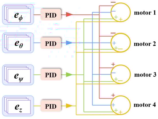 The construction of a stable flight control system largely depends on the accuracy of the construction of the rotorcraft UAV dynamics model and kinematics model. Gu et al. [12] pointed out that poorly derived or defined models may have adverse effects on subsequent controller synthesis, such as parameter uncertainty and neglected highly nonlinear modeling, resulting in unacceptable calculation results. Therefore, a prerequisite for the design of a flight stability control system is to build a model that can accurately reflect the dynamic and motion characteristics of the rotorcraft UAV. By using real and accurate controlled object data, the performance of the control system can be directly fed back and optimized. In the height control of rotorcraft UAVs, classical PID adjusts the power output according to the deviation between the set height and the actual height, while the deviation integral and the deviation differential and its control algorithm are simple in principle and relatively small in the calculation [13,14,15]. Yuksek et al. [16] designed PID controllers for the roll, pitch, and yaw channels, respectively, and verified their effectiveness through flight experiments. Yi et al. [17] applied the genetic algorithm to optimize the PID controller to realize attitude control of quadrotor UAVs. However, the PID controllers in the existing literature fail to determine the optimal control parameters effectively, which often leads to large control errors. However, in complex scenarios, classical PID has shortcomings in adjusting attitude changes quickly and accurately due to fixed parameters [18,19]. In rotorcraft UAV flight control, adaptive PID can adjust the PID parameters in real time according to the operating state of the system to ensure flight stability. However, the algorithm for this method is relatively complex, which requires high computing power on the part of rotorcraft UAVs, and the stability of the parameter adjustment process needs careful design [20,21]. Fuzzy PID can combine fuzzy rules to process uncertain information in UAV flight control and has certain adaptability to complex environments. However, the design of fuzzy rules depends on a large amount of flight test data, and it is difficult to design and adjust the rules for complex and changeable scenarios [22,23].