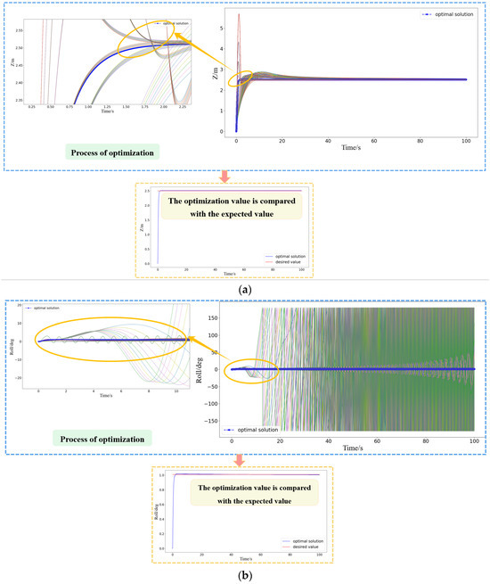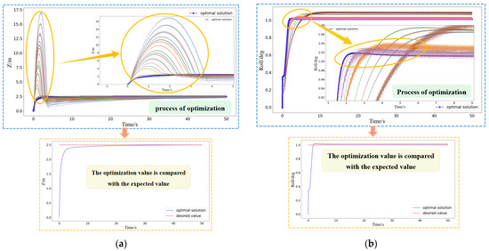 (3) By comparing the simulation results of the altitude and attitude control effects of the quadrotor and dual-rotor coaxial UAVs with optimized PID parameters, it can be observed that the optimal parameter range of rotorcraft UAVs is relatively narrow. Through the use of the intelligent PID self-optimization algorithm, the optimal PID control parameters can be effectively identified, and the system can be transformed from an unstable state to a controllable state with a minimum steady-state error. It is worth noting that the controller feedback effect of the quadrotor UAV is better than that of the dual-rotor coaxial UAV. The stability and control accuracy of the dual-rotor coaxial model under the same controller are lower than those of the quadrotor model. Moreover, due to the nonlinear characteristics of the dual-rotor coaxial UAV, the control of dynamic behavior in the initial response stage is extremely difficult, which leaves room for the improvement of the control performance.