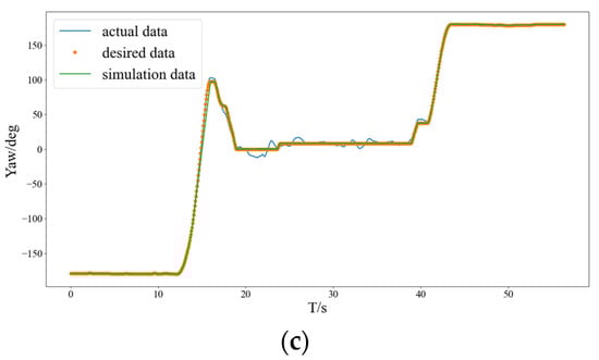 Euler angle attitude comparison of the dual-rotor coaxial UAV: expected, actual and simulation values: (a) pitch angle, (b) roll angle, and (c) yaw angle.