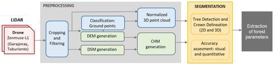 A complete processing protocol is essential to transform raw LiDAR clouds into valuable information products that support forest conservation. The general workflow for processing LiDAR data typically involves several steps: (i) data acquisition to collect the raw LiDAR data, (ii) filtering to remove noise and irrelevant data points; (iii) classification to label each cloud point into ground, vegetation, and other categories; (iv) model generation to create continuous models from the classified points, using interpolation, to derive the Digital Elevation Models (DEMs), Digital Surface Models (DSMs), and the Canopy Height Models (CHMs) by subtracting the DEM from the DSM. Figure 3 shows the general overview of the methodology applied to extract individual tree parameters. The blue boxes represent processes or data involving the 3D point clouds, while the green boxes are related to the raster images. As shown in the diagram, segmentation algorithms are applied to either 3D or 2D data, depending on the context.
