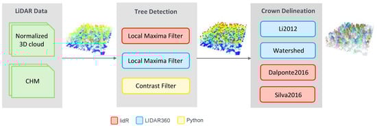 Selected algorithms to compare the performance of individual tree detection and crown delineation methods (Software implementation is represented by red, blue, and yellow colors and discussed in Section 3).