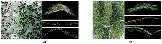 Specifically, ALS is particularly useful for regional planning, allowing managers to identify areas at risk of degradation or requiring restoration, while ULS, on the other hand, excels in mapping fine-scale attributes. In particular, segmenting individual trees enables detailed assessments of tree structure, health, and spatial distribution, which are essential for sustainable forestry practices and ecological research. In our study, high-quality and high-density LiDAR data were used, and a significant effort was made to generate accurate canopy height models and normalized point clouds, as these input datasets influence the accuracy of the segmentation algorithms. Two quite different ecosystems were examined: (i) Taburiente, an area populated by conifers with a moderate degree of overlapping in the tree crowns and some areas with gaps between trees, and (ii) Garajonay, a very complex area dominated by laurel and fayal-brezal forests with an extremely high density of trees and very complex morphologies, as shown in Figure 2b. Consequently, good results in Garajonay could not be achieved, even having the precise location of the trees and using advanced processing techniques. Figure 13 shows examples of the true color composite and vertical profiles to emphasize the complexity of the area to identify individual trees.