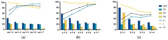 Figure 8 summarizes the main results achieved after the analysis. A wider range of values for each parameter was evaluated, but, after the visual assessment, and for the sake of clarity, only the most relevant values have been included. Graphs show the main common metrics: precision (p), recall (r) and F1-score (F1), which are calculated using the number of trees detected (DET), true positives (TP), false positives (FP), and false negatives (FN). Precision evaluates the accuracy of tree detection, whereas recall is the tree detection rate. As mentioned, the F1 score provides a full measure to compare an algorithm’s overall accuracy by integrating both precision and recall. These metrics (r, p, F1) range from 0 to 100%, with 100% representing the highest accuracy. We can appreciate that CF does not provide good results irrespective of the C value, while LMF is a proper approach to detect the seeds for the segmentation techniques when the appropriate parameter values are selected.