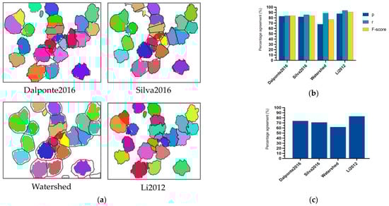 Numerically, we first counted the number of detected, over-segmented, and undetected trees for each algorithm. Precision, recall, and F1-score were also calculated, at the pixel level in this case, to quantify the delineation capability of tree regions. In this way, the TP, FP, and FN of each tree were calculated and then, for each algorithm. The IoU was also obtained, matching each tree with its corresponding one in the reference. In case of over-segmentation, the representative tree is assumed to be the one with the largest area. Then, the intersection (common area of reference and segmentation based on LiDAR data) and the union (areas of both polygons) are computed. Finally, the IoU is calculated as the division of the intersection by the union. A summary of some results is presented in Figure 10b. They show that segmentations on the CHM have similar performance, the best being Dalponte2016 (IoU = 74%, F1-score = 84%) and, the worst, Watershed (IoU = 62%, F1-score = 77%). However, the best overall segmentation algorithm is the one applied to the point cloud, Li2012 (IoU = 83%, F1-score = 91%), showing significantly better results comparatively. As the reference plot was carefully selected to be representative of the broader area in terms of vegetation density and distribution, as well as topography, the conclusions are generalizable to the entire region. In fact, the visual analysis of the derived segmentation regions for the entire area corroborated the quantitative results.