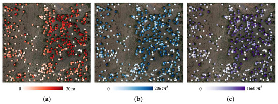 Forest metrics of Taburiente: (a) height, (b) area, and (c) volume.