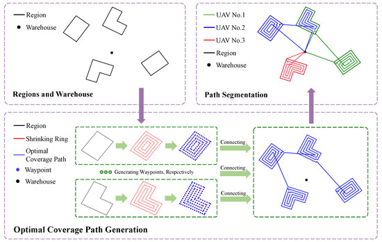 This section provides a detailed explanation of the first stage of SSDP. The core idea is to use iterative polygon offsetting operations to generate an optimal coverage path for all target regions, whether convex or non-convex. The following subsections discuss the principles of generating shrinking rings through polygon offset, strategies for evenly distributing waypoints, and methods for orderly connection of waypoints between rings. These steps lay a solid foundation for the subsequent path segmentation and allocation processes.