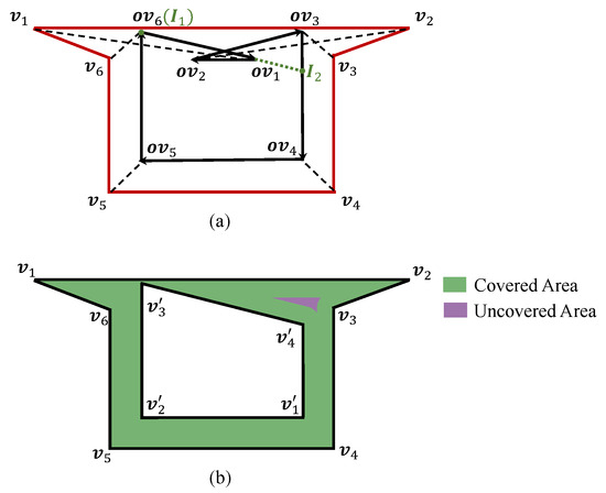 According to CASE 2, may form globally invalid loops. These loops fall entirely within the UAV’s photography range as it follows the previous shrinking ring. This results in no improvement in coverage and increases the path length. To eliminate these globally invalid loops, we identify the self-intersection points within the overall loop formed by . Based on these points, we trim the line segments and ultimately extract the shrinking rings.